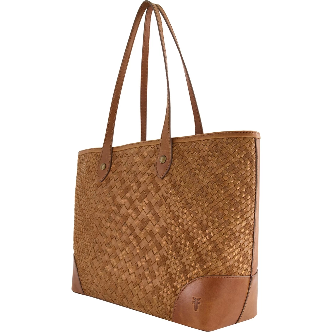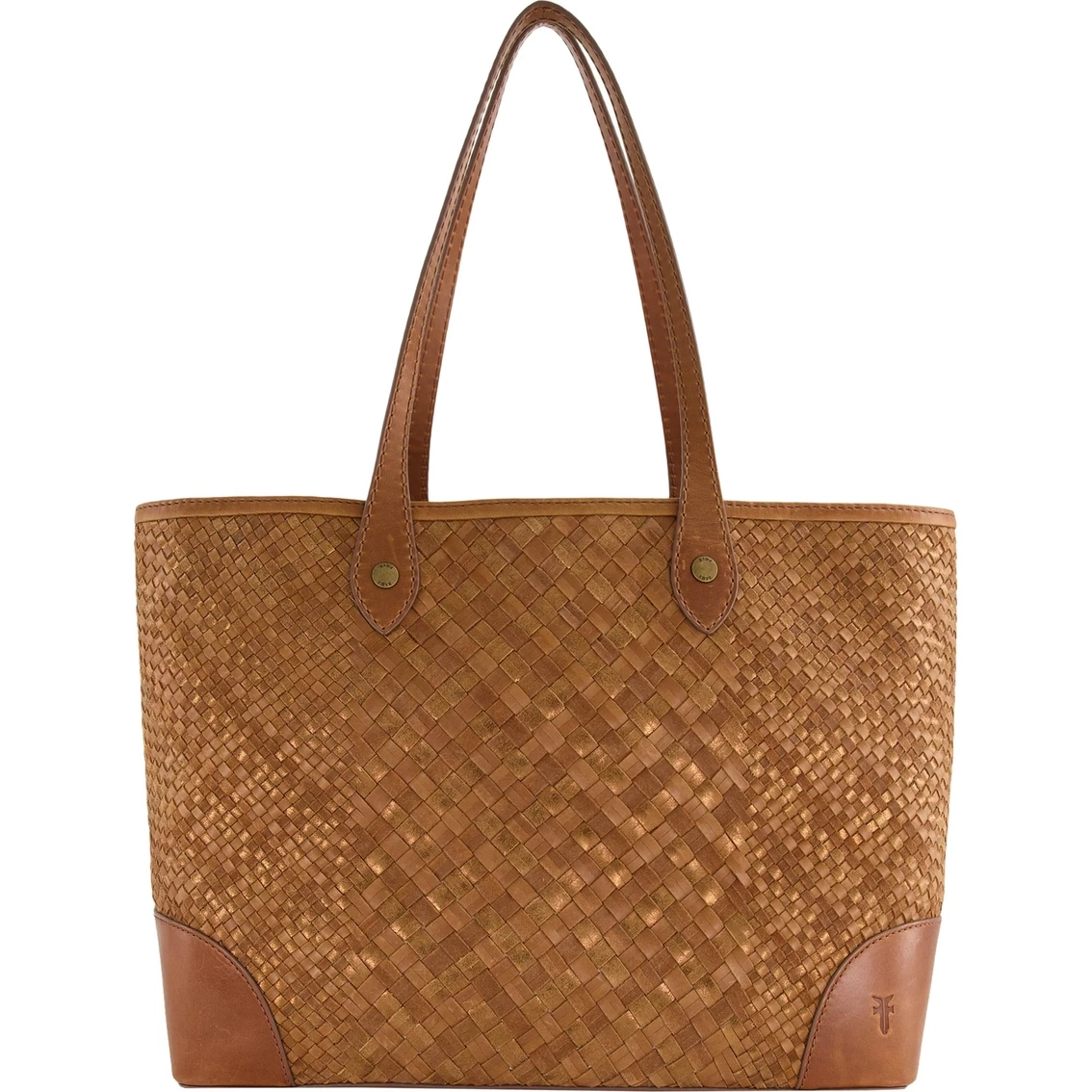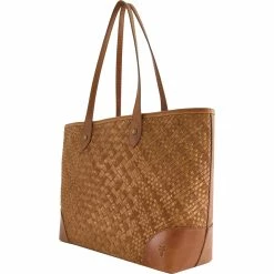 Made from beautiful pull-up leather with signature Melissa buttons, this Metallic Basket Woven shopper tote bag from Frye is the perfect size for a hectic day or weekend away.