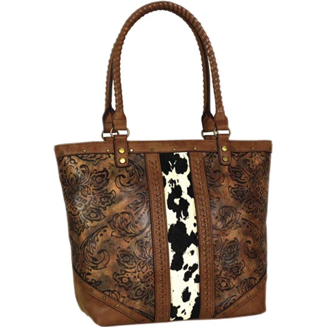Featuring a left/right concealed carry pocket, this tooled tote from Justin is perfect for a lady who wants to keep her gun easily accessible when on the go. It is sure to add a western touch to your look. The bag is designed with brindle trim, genuine hair hide trim, one compartment, one zip pocket, two organizational pockets and a zipper closure. Style: 2024309.