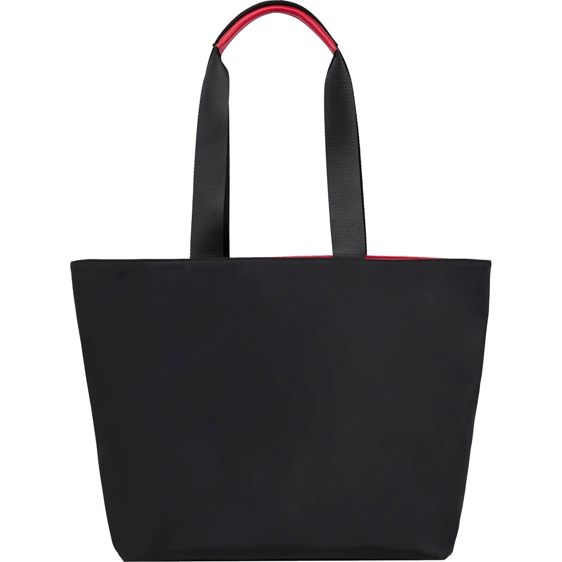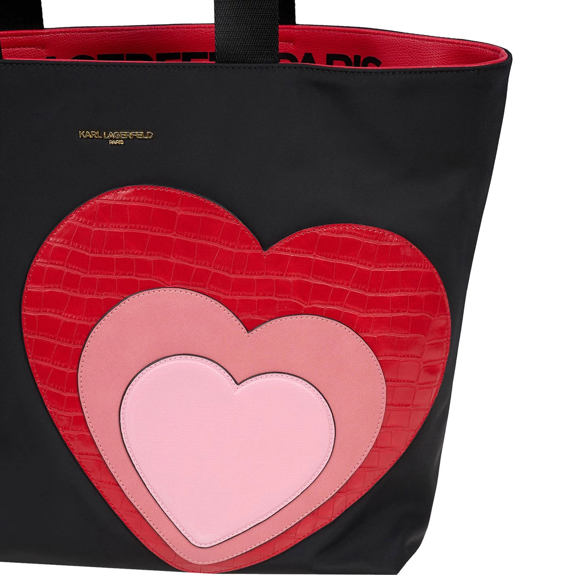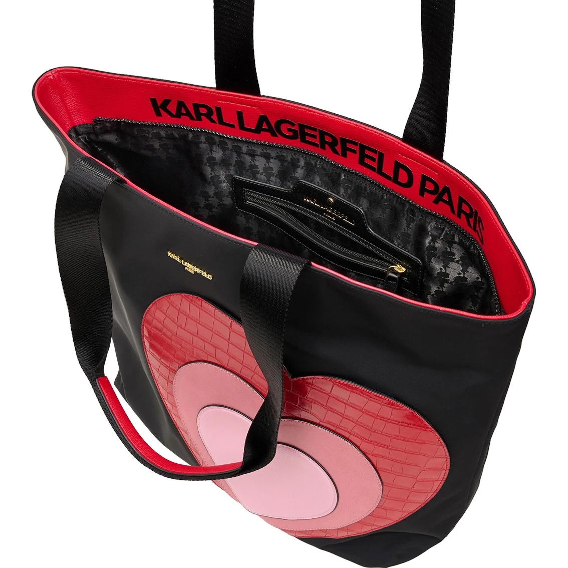 Carry your essentials in style. The Amour Collection offers a charming yet sophisticated mix of handbags. This tote from Karl Lagerfeld promises the ultimate everyday bag with playful twists. Features top zipper closure, two interior slip pockets, a zipper pocket and double top handle with a 9-inch handle drop. Nylon materials. Black Apple Red. Style: LH2BE3ADZPD.