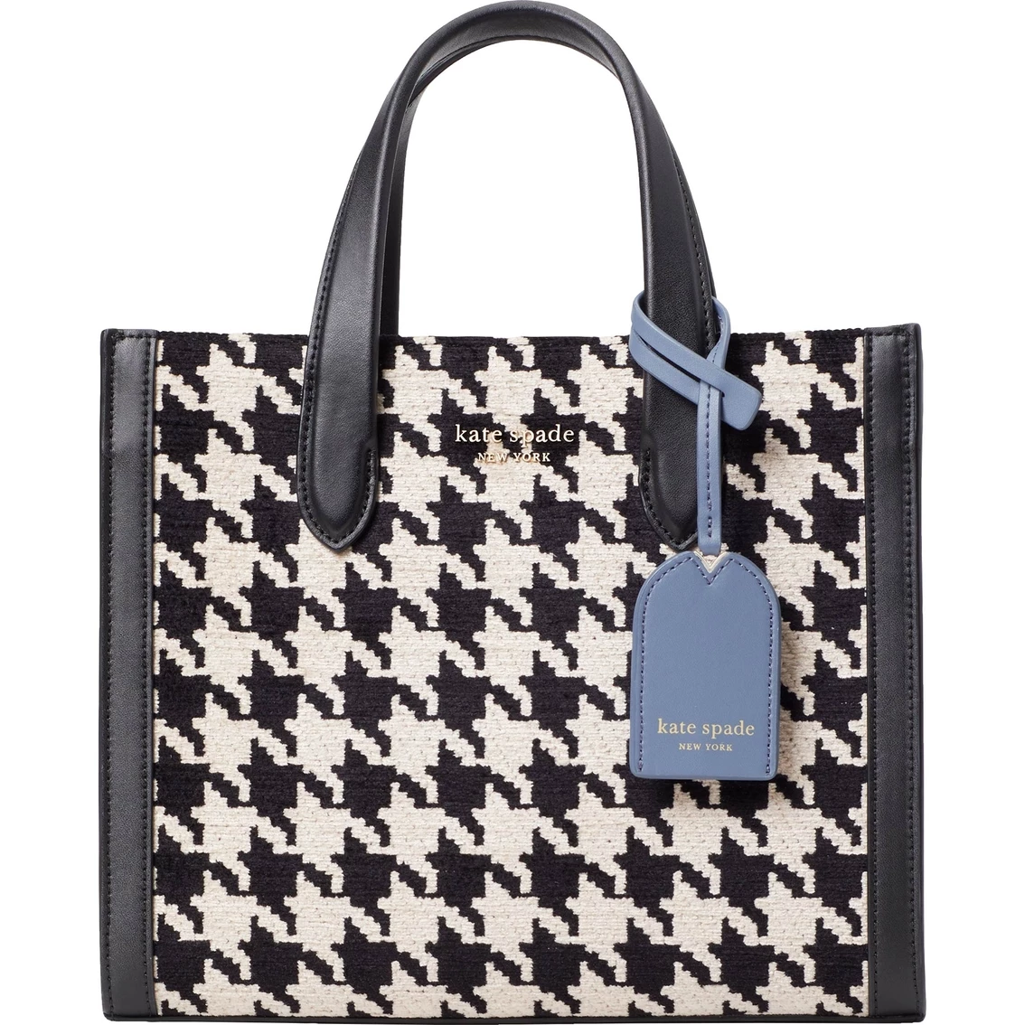 Kate Spade New York’s Manhattan Houndstooth Chenille Fabric Small Tote features a zip pocket and snap pocket for convenient storage. It’s large enough to fit an iPhone Max, zip-around continental bag and an iPad. Style: K5500001.