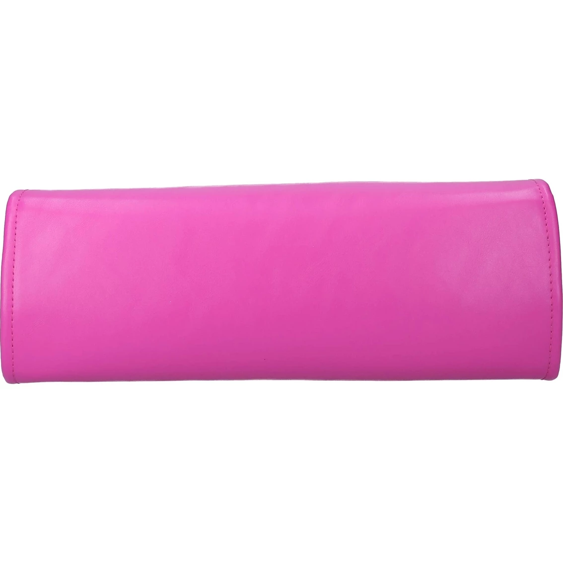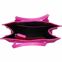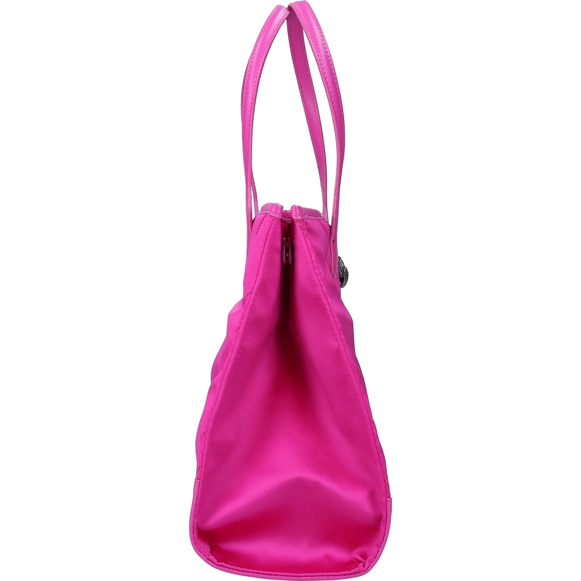 The Kurt Geiger Square Small Shopper purse features a fuchsia quilted exterior with a square silhouette. The sides feature two poppers to make room. This purse is finished with a silver Eagle head embellishment, and the two top handles can be held in the hand. The top zip reveals a lined interior with small pocket. Color: Fuchsia. Style: 8670952229.