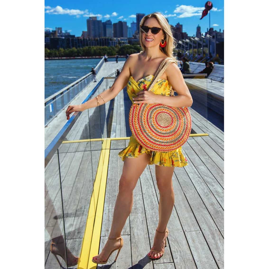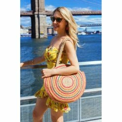 The Magid Circle Straw Jute Tote is a vibrant handmade in India straw jute tote featuring swirl woven pattern rainbow braided jute. Handles are long and durable. Perfect for your easy summer style. Style: D9202S-NATURAL.