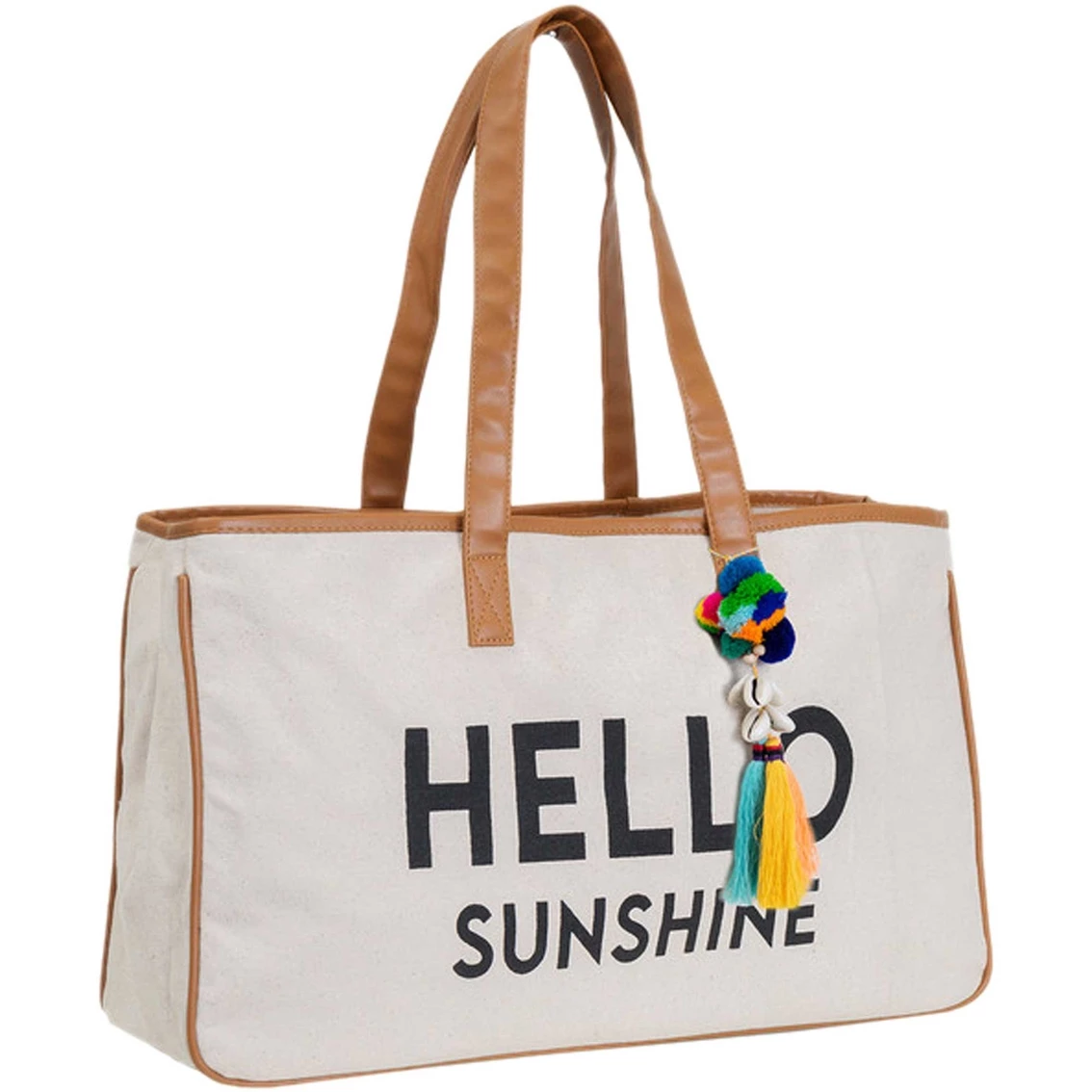 Make a fashionable statement with a slogan beach tote. This summer ready natural cotton canvas beach tote from Magid features vegan leather handles and a snap closure. The tote is accented with a novelty tassel. Style: D9202S-NATURAL.