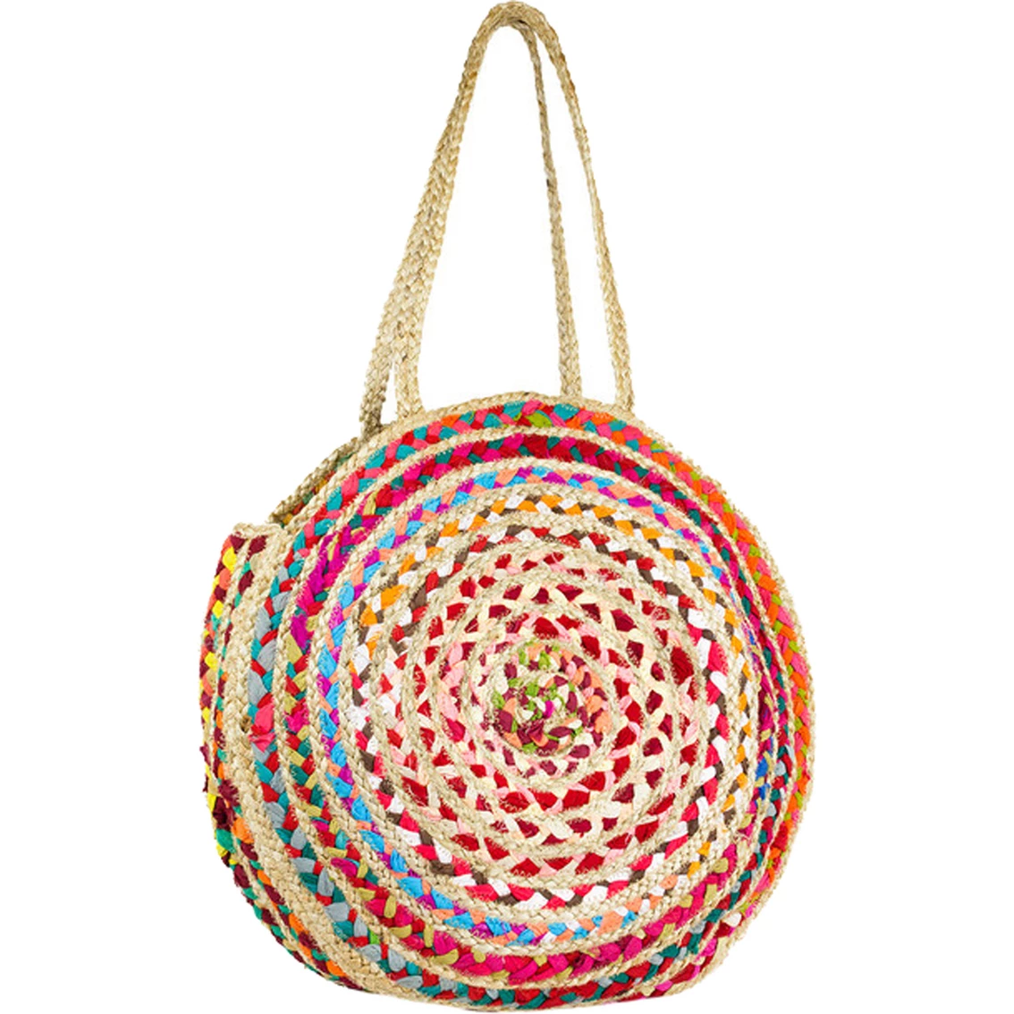 The Magid Jumbo Rainbow Jute Straw Circle Tote is a vibrant handmade in India straw jute large jumbo tote featuring rainbow cotton braided with jute. The perfect size to fit a towel for the beach or to dress up this summer. Handles are long and durable. Style: D9202S-NATURAL.