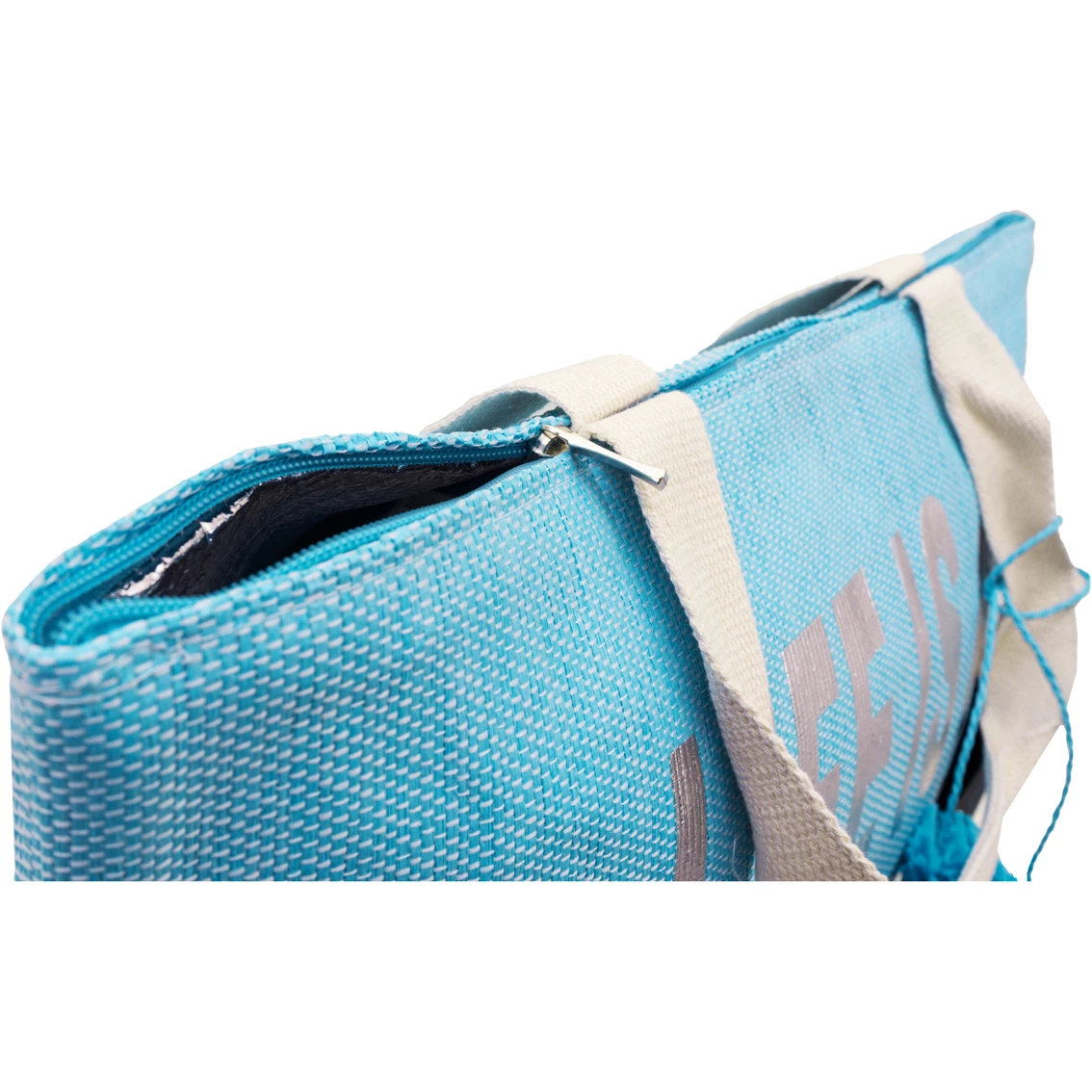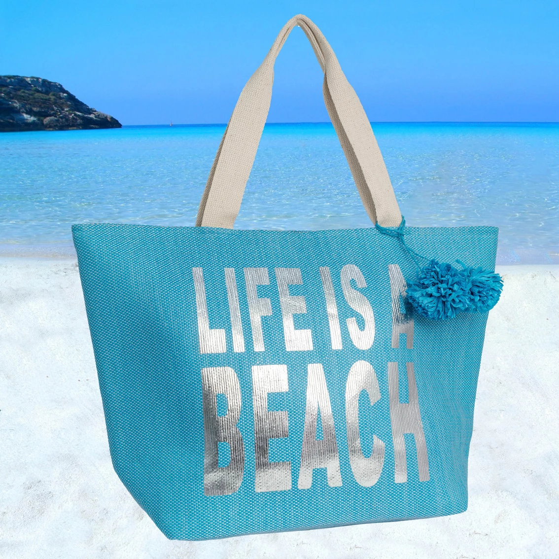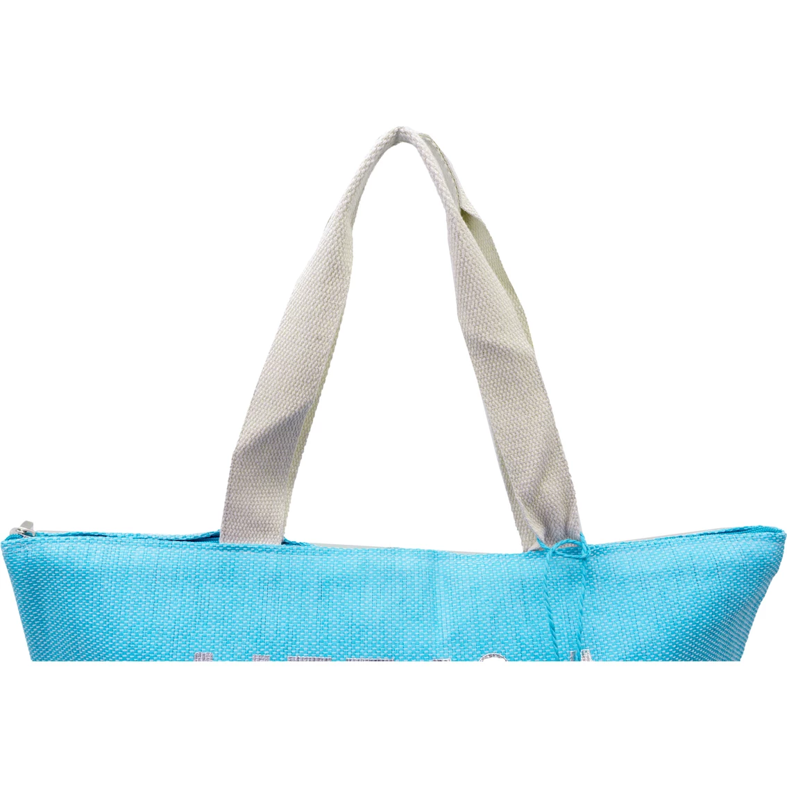 A fun summer-ready metallic gold verbiage print straw beach tote. This Magid Life Is A Beach Insulated Straw Beach Tote features accent tassels, durable cotton webbed handles and high quality woven straw. Metallic PEVA Insulated inner lining is perfect for keeping your drinks cool on the go. Model: PI-111-TQ.