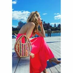 The Magid Petite Straw Jute Cut Out Handle Tote is a vibrant handmade in India bag. This petite straw jute handbag in rainbow cotton braided with jute features cutout handles. The perfect bag for a day to night look. Style: D9202S-NATURAL.