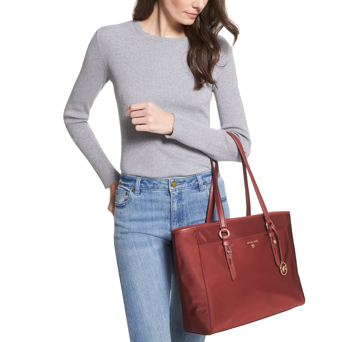 Carry your essentials in style. Meet the Sullivan Large Tote with a zip top. This beautiful tote in Brandy is perfect, featuring two side exterior pockets for quick access to your essentials. 18K hardware. Dust bag included.