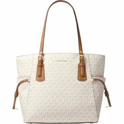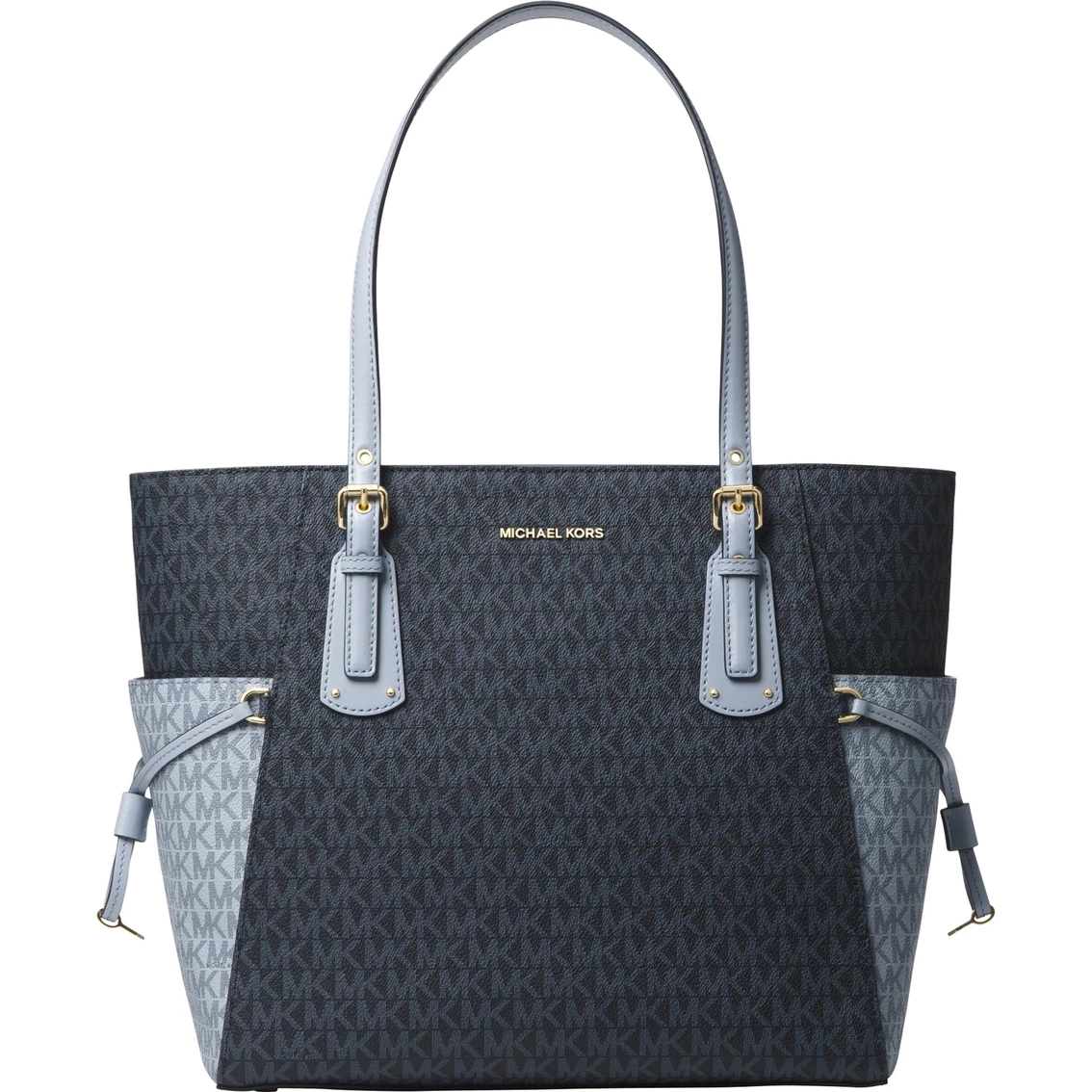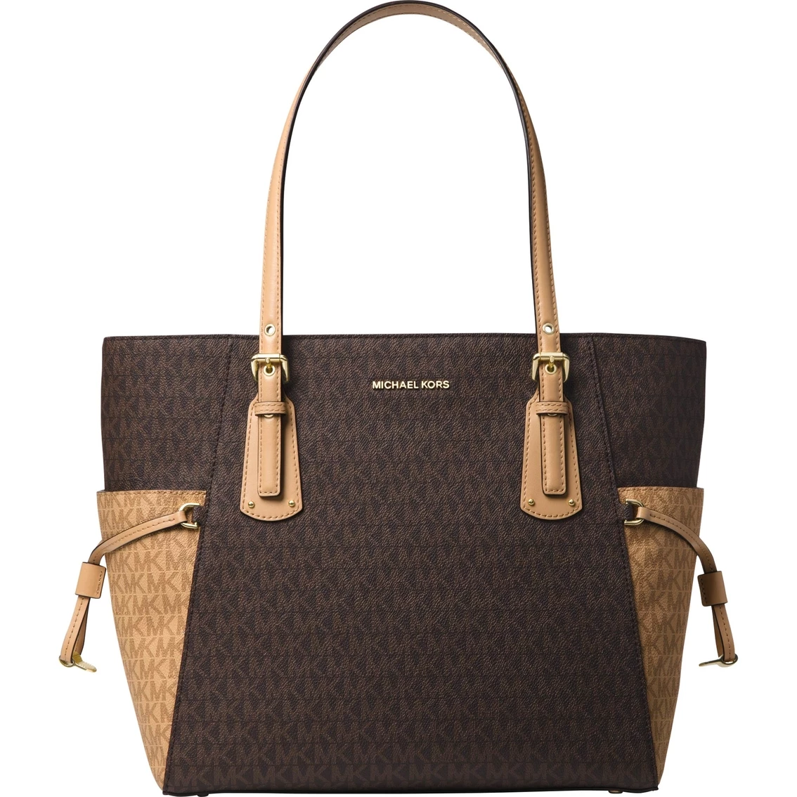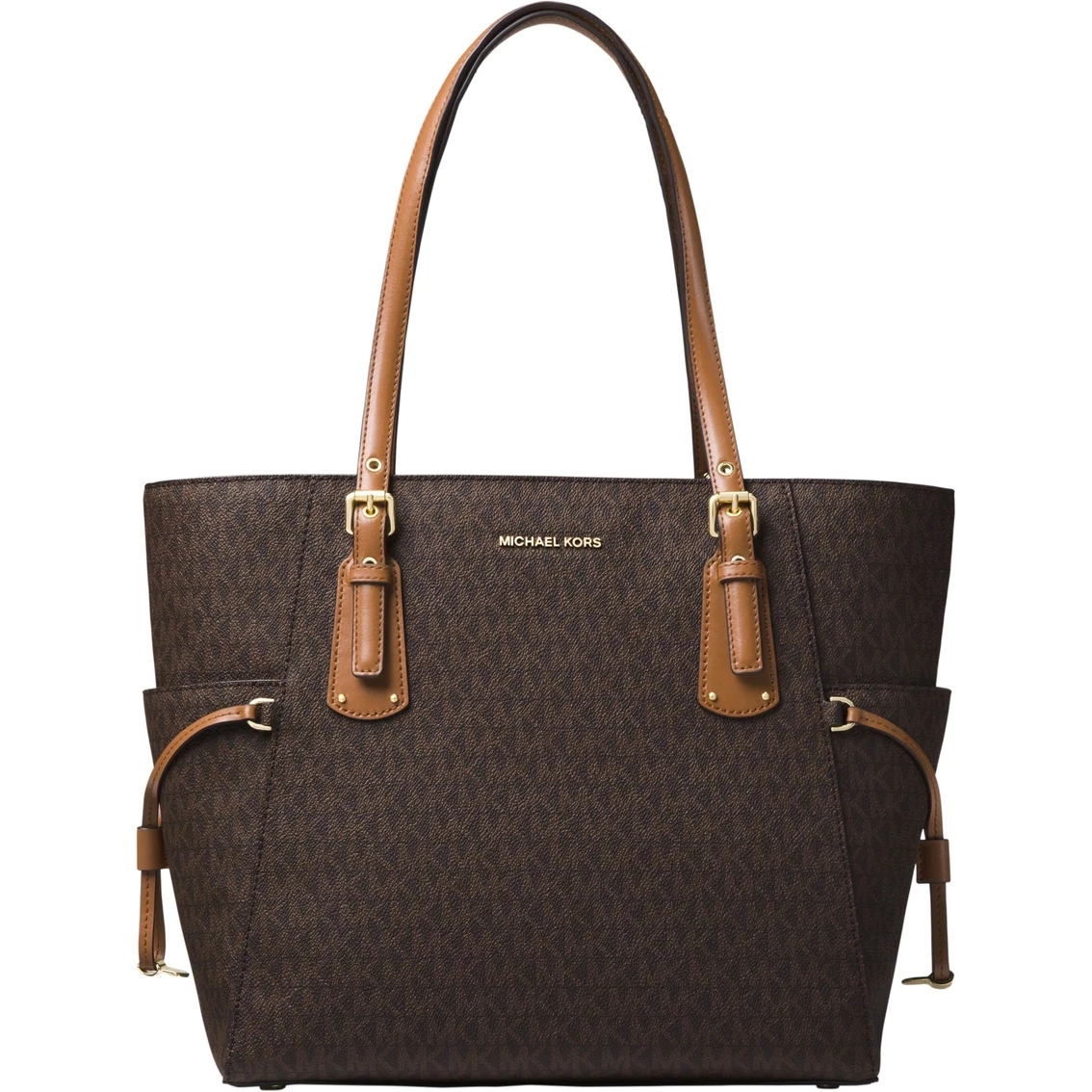 Crafted of MK Signature coated twill, the Michael Kors Voyager East West Signature Tote features dual adjustable shoulder straps and gusset ties for everyday versatility. Its signature design promises everlasting appeal, while refined hardware and a logo charm lend a sophisticated finish. This tote features exterior side slip pockets, drawstring detail on sides and goldtone hardware. The lined interior has a center zip compartment, backwall zip pockets and multifunction slip pockets. Style: 30T8GV6T4B.